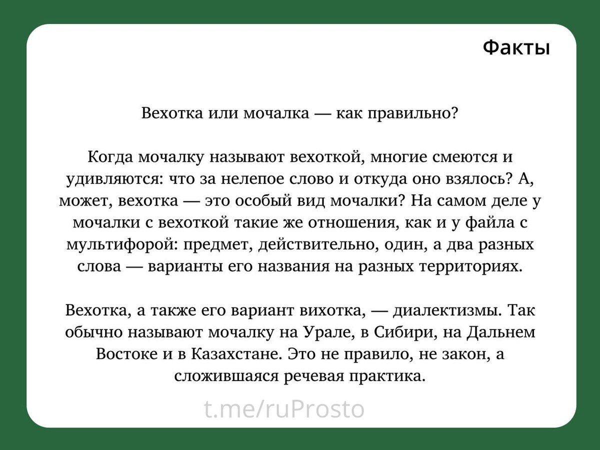 🌐 Факты Вехотка или мочалка — как правильно? Когда мочалку называют вехоткой, многие смеются и удивляются: что за нелепое слово и откуда оно взялось? А, может, вехотка — это особый вид мочалки? На самом деле у мочалки с вехоткой такие же отношения, как и у файла с мультифорой: предмет, действительно, один, а два разных слова — варианты его названия на разных территориях. Вехотка, а также его вариант вихотка, — диалектизмы. Так обычно называют мочалку на Урале, в Сибири, на Дальнем Востоке и в Казахстане. Это не правило, не закон, а сложившаяся речевая практика. 🏠 #Факты MERLIN — Выучите Английский, читая отрывки из книг