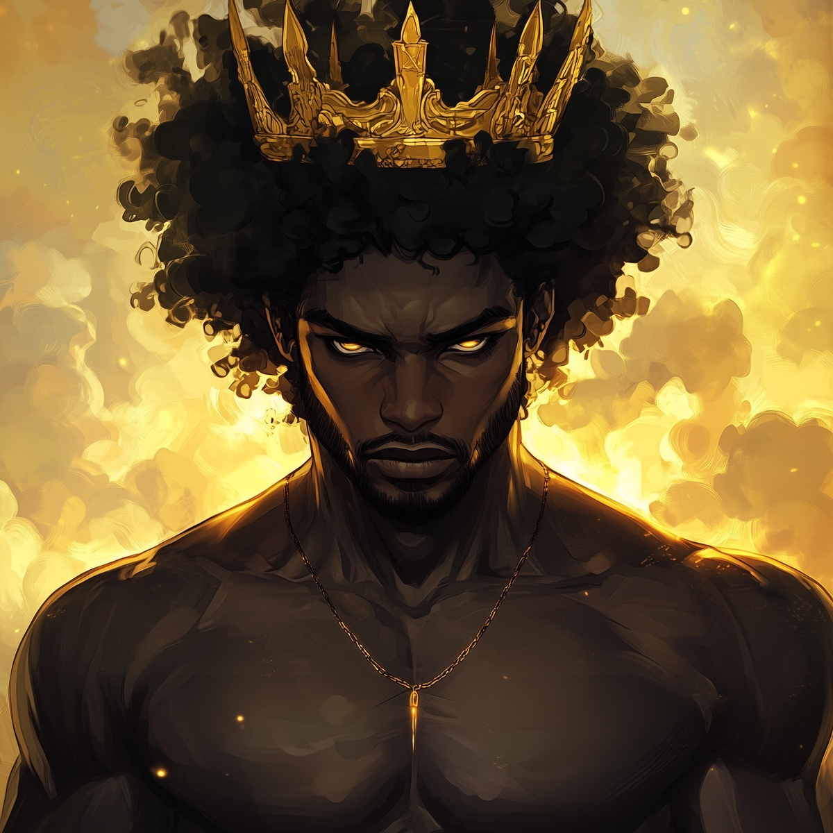 Создано на основе запроса: black strong anime man , has a Afro, powerful eyes, wearing a gold crown, mysterious aura, full body image including torso, yellow/gold background with clouds, very masculine