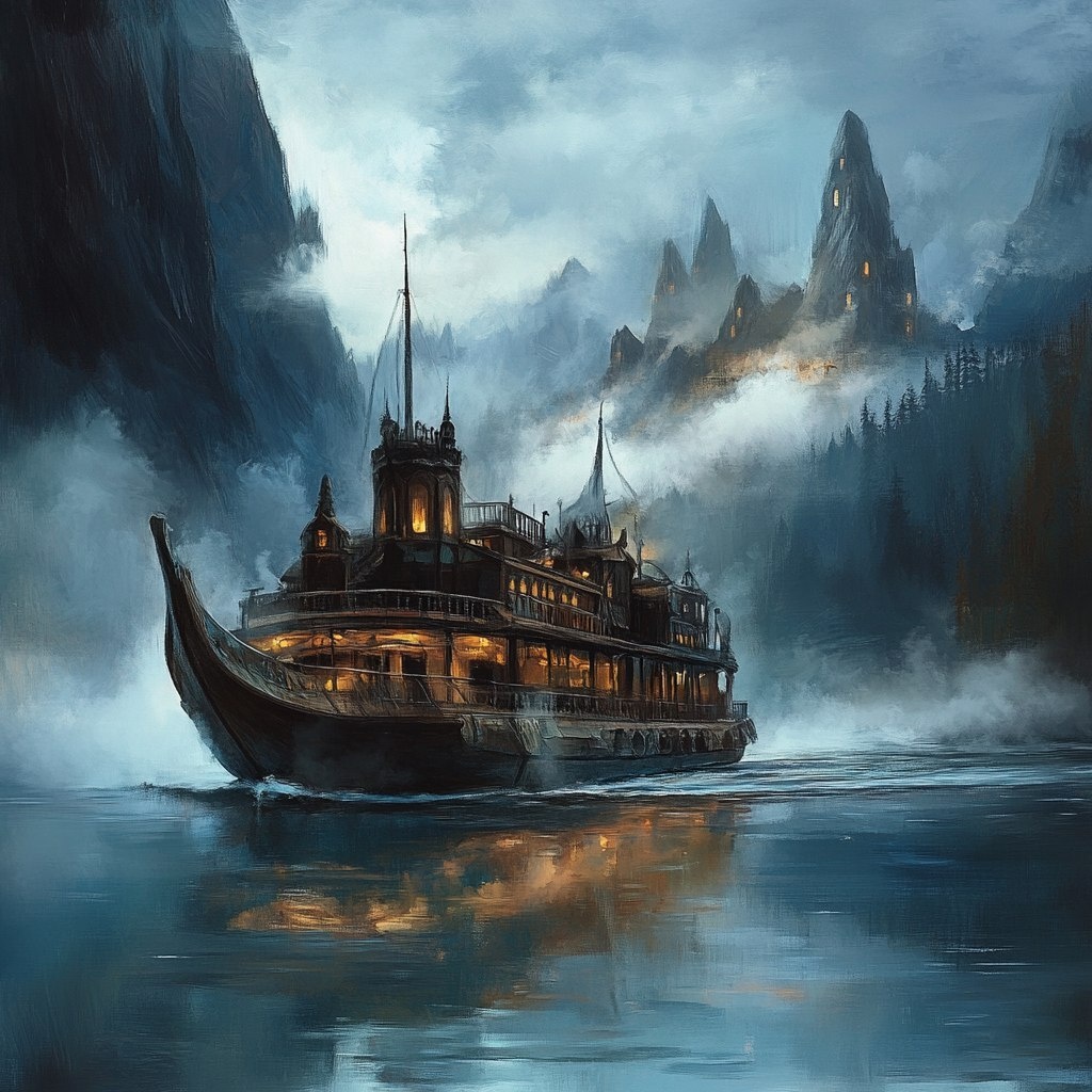 Создано на основе запроса: dungeons and dragons oil painting style arcane paddle steam river boat HD V7