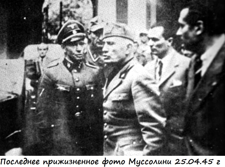 27 апреля 1945 г. Муссолини с несколькими верными ему приближенными, единомышленницей и любовницей Кларой Петаччи попытался покинуть территорию Италии, борьбе за которую он посвятил всю свою жизнь, в колонне отступающих немцев. Однако у деревни Муссо колонна вермахта была остановлена партизанским отрядом и подвергнута досмотру. Командир колонны пытался укрыть Муссолини в кузове грузовика, дав ему переодеться в форму немецкого унтер-офицера. Однако обман не удался: партизаны узнали бывшего вождя итальянской нации и в немецкой форме.
