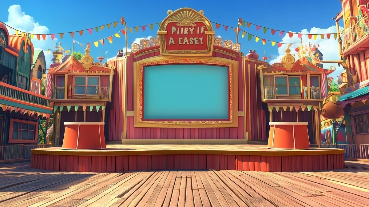 Автоперевод: Красочная дневная карнавальная сцена, показывающая живой конкурс викторины: большая сцена с двумя подиумами для участников (слева и справа), центральный экран или доска для вопроса о витринах, и перед сценой, место для пустых аудитории, в стиле Pixar