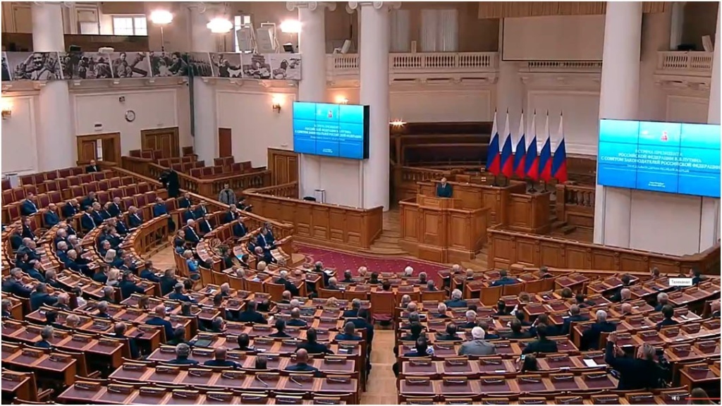 Выступая перед собравшимися Владимир Путин отметил, что необходимо использовать лучшие региональные практики для создания единых стандартов оказания помощи военнослужащим, участникам СВО. Фото: Пресс-служба Законодательного Собрания Ульяновской области