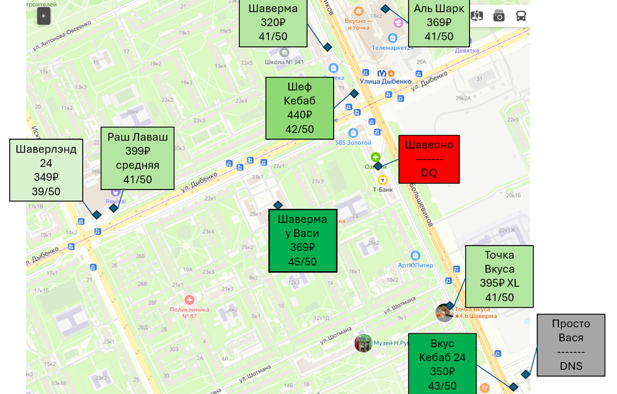 Вывод для тех, кому лень читать. Победитель - шаверма "у Васи" на Дыбенко 25 (не путать с "просто вася"!). Если вам некогда гулять по району, "Аль Шарк" в ТЦ "Невский" или шаверма прямо напротив метро - достойный варианты. Если двигаться в сторону Народной, то "Вкус кебаб 24" - вполне. Надо отметить, что средний уровень района неплохой, никаких провалов нет (да, "Шаверно" дисквалифицировал, но там, где шаверма участвовала в конкурсе, оценка не ниже 39).