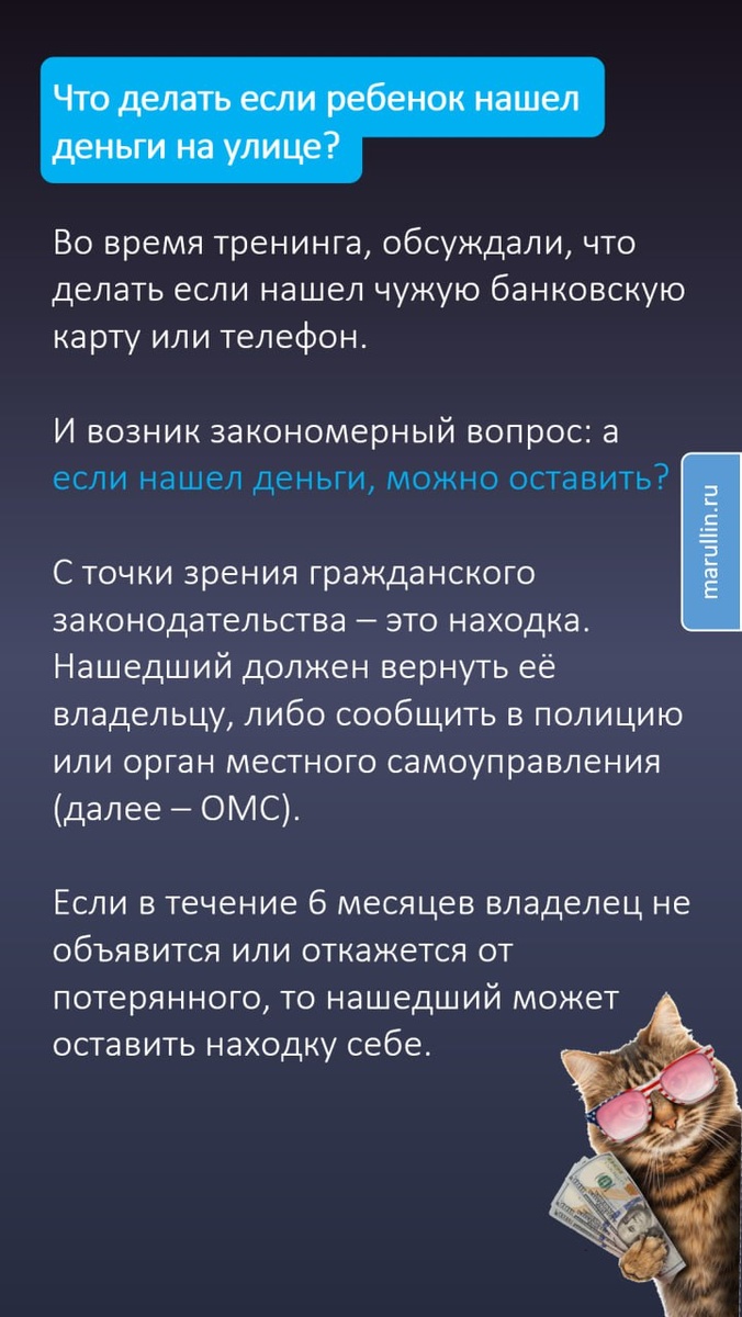 Что делать если ребенок нашел деньги на улице? Во время тренинга, обсуждали, что делать если нашел чужую банковскую карту или телефон. И возник закономерный вопрос: а если нашел деньги, можно оставить? С точки зрения гражданского законодательства – это находка. Нашедший должен вернуть её владельцу, либо сообщить в полицию или орган местного самоуправления (далее – ОМС). Если в течение 6 месяцев владелец не объявится или откажется от потерянного, то нашедший может оставить находку себе. А если найденные деньги оставить себе и никому ничего не сказать? Если не разыскать владельца, не сообщить в полицию или ОМС, то наступает административная ответственность по ст. 7.27 КоАП РФ. (мелкое хищение). Она наступает с 16 лет, и если стоимость имущества не превышает 1000 рублей, то ч. 1 ст. 7.27 КоАП, если больше 2500 рублей, то ч. 2 ст. 7.27 КоАП РФ. Наказание –от штрафа до обязательных работ. А если переквалифицируют в кражу, то это уже ст. 158 УК РФ. и наступает уголовная ответственност