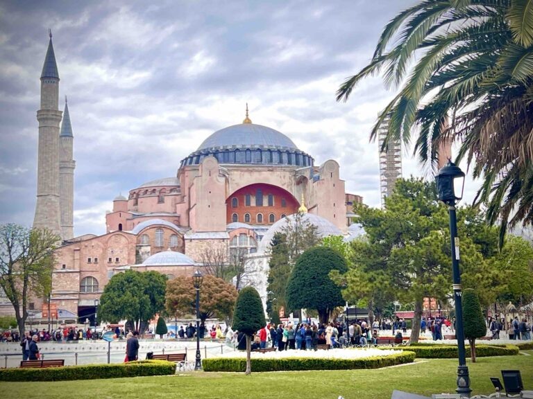 Здесь их так много, как ни в одном из других городов мира, насчитывают до трех тысяч. Пробежимся по самым лучшим, известным и красивым, заглянем внутрь. Сразу скажу – приехать в Стамбул и не побывать в его главных мусульманских святынях – тогда не стоило приезжать. После завоевания Константинополя турками-османами многие христианские святыни были разграблены и разрушены, на из развалинах стали вырастать многочисленные мечети. Наиболее крупные и богатые храмы и соборы были превращены в мусульманские святилища. Такова судьба Собора Святой Софии, после незначительной перестройки ее стали именовать Айя-София. Это один из наидревнейших храмов, возраст которого насчитывает около полутора тысячелетий. При этом, несмотря на многочисленные землетрясения, здание устояло и сохранилось. Красивый величественный храм настолько поразил завоевателей, что его формы стали основой «османского» архитектурного стиля. Все турецкие мечети строились по единому плану. Основное здание прямоугольной формы