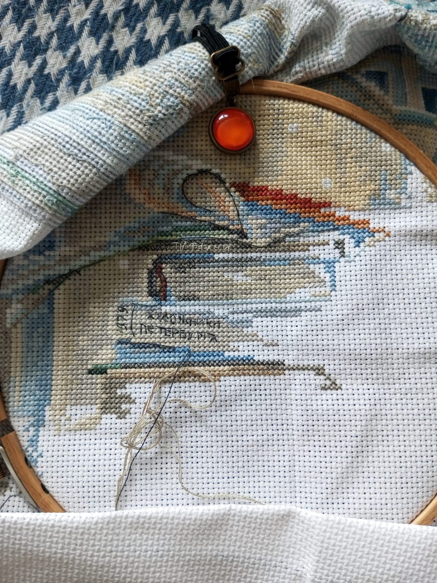 Все отчеты собираю тут, по ссылке Двигаюсь очень медленно- в выходные времени на вышивку мало. Сразу делаю бэк- он тут очень сложный- мелкий и дробный. Потихоньку справляюсь. Ну и рыжего помощника в ленту))) вот как уже подглядывает. Прекрасный дизайн, очень приятная вышивка. Хотела кошечку закончить в апреле, но вряд ли удастся. Бэк, думаю, на майских праздниках буду делать. Работа маленькая, но много цветов: шить, в принципе, несложно, просто времени на вышивку не хватает. Появилась первая завитушка книги слева. По площади уже почти половина, по количеству стежков нет ещё и 40%. Абсолютно нефотогеничный дизайн! Тончайшие переходы нежно-голубых оттенков на фото становятся скучными серыми. Доброе утро! Мой котейка потихоньку подрастает. Спасибо огромное за идею вышить котиков, иначе не знаю, когда бы руки до него дошли. Во всяком случае, в этом году он в приоритете точно не был. А теперь захватил. Нет цветочка Есть цветочек Разворачиваю ткань, чтобы запечатлеть масштаб вышитог