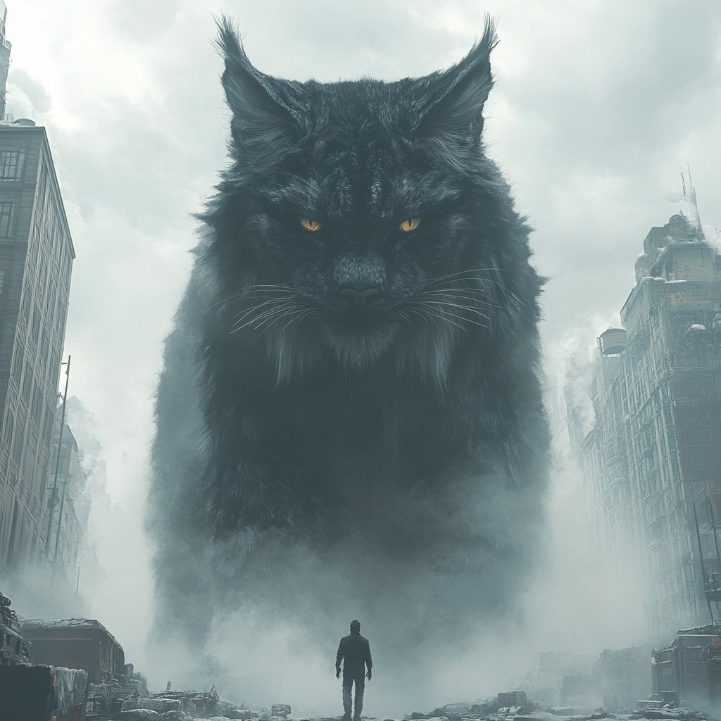 Создано на основе запроса: giant black lynx, standing in the city surrounded by fog and mist, man walking towards it from behind, fantasy