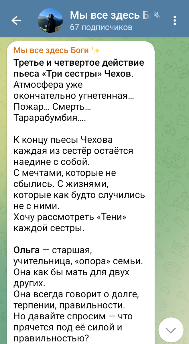 Здравствуйте, наши уважаемые читатели, друзья, ребята. Хотим вам показать два очень интересных текста с канала "Мы все здесь Боги". Канал ведёт ученица другого нашего курса. Курс этот называется "Изучаю себя". **** "Третье и четвертое действие пьесы «Три сестры» Чехова. Атмосфера уже окончательно угнетенная… Пожар… Смерть…Тарарабумбия…. К концу пьесы Чехова каждая из сестёр остаётся наедине с собой. С мечтами, которые не сбылись. С жизнями, которые как будто случились не с ними. Хочу рассмотреть «Тени» каждой сестры. Ольга — старшая, учительница, «опора» семьи. Она как бы мать для двух других. Она всегда говорит о долге, терпении, правильности. Но давайте спросим — что прячется под её силой и правильностью? Тень Ольги — Госпожа Железная. Злая мать и Жертва. Усталость, обида, желание сбежать от ответственности. В ней живёт глубоко спрятанная зависть к тем, кто свободен, к мужчинам, к тем, кто выбирает себя, а не других. Она боится быть слабой. У неё — тень неудовлетворённой женщи