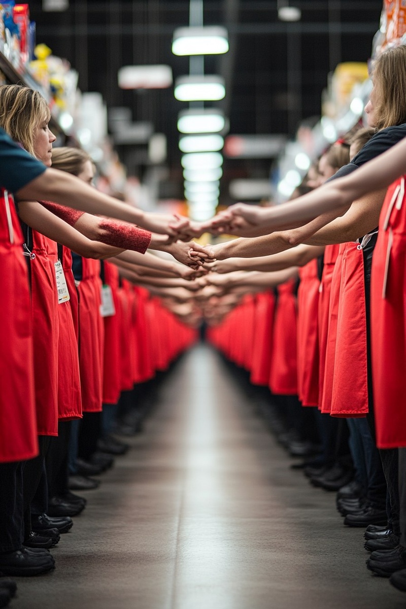 Создано на основе запроса: human chain of supermarket cashiers holding hands wearing red aprons. The human chain enters a supermarket