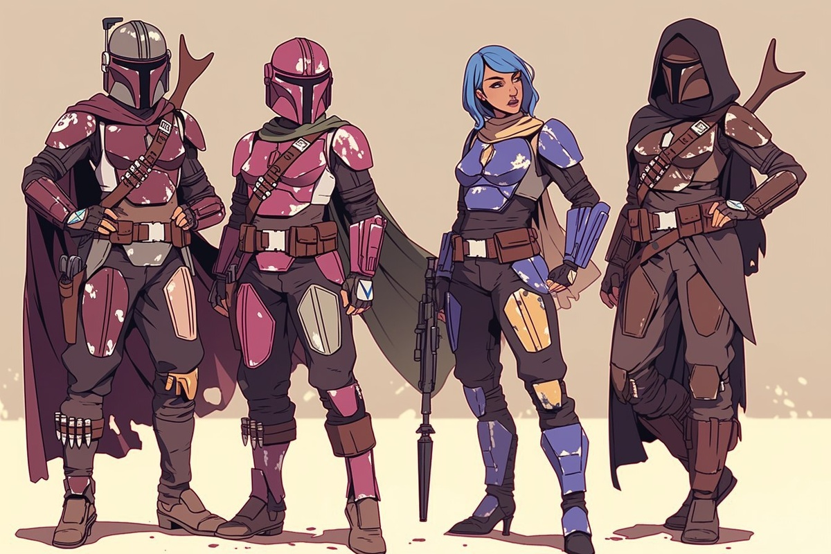 Создано на основе запроса: Mandalorian Male and Female Characters, Anime Cartoon Style Art, Reimagined Star Wars Mandalorians, Mix of Bright