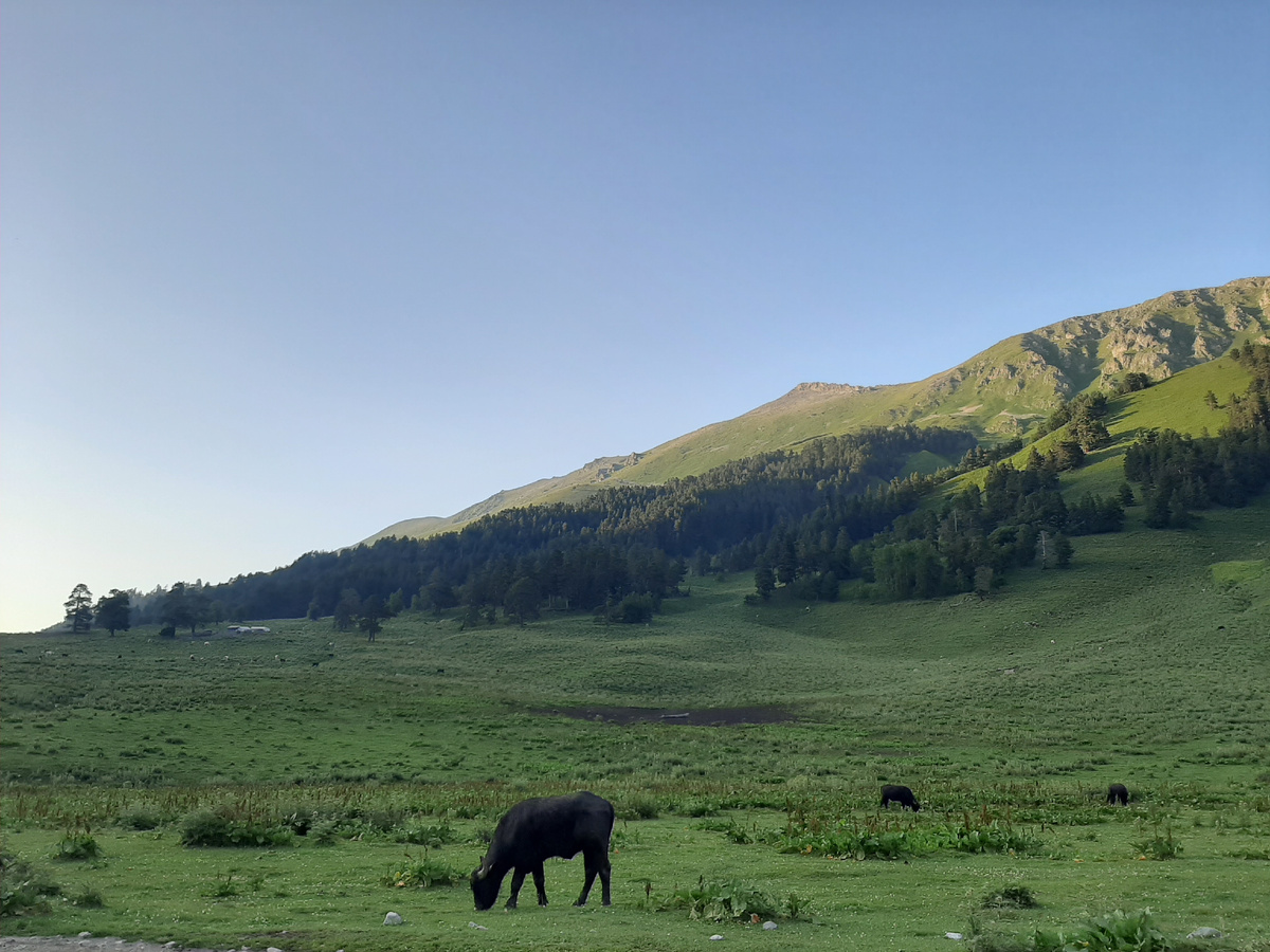 Так вот маршрут на Седло мы начали от нашего палаточного лагеря на Ледниковой Ферме, дошли до Белочки, перешли по мостику и направились в сторону хребта Чагет-Чат, что по левой стороне долины (если стоять лицом к Седлу). Наш путь идет на высоте более 2000 метров и поднявшись по лесной зоне на спинку хребтика мы оказались в зоне альпийских лугов. Тень тут только снилась, жарило нещадно и вода уходила на ура.
