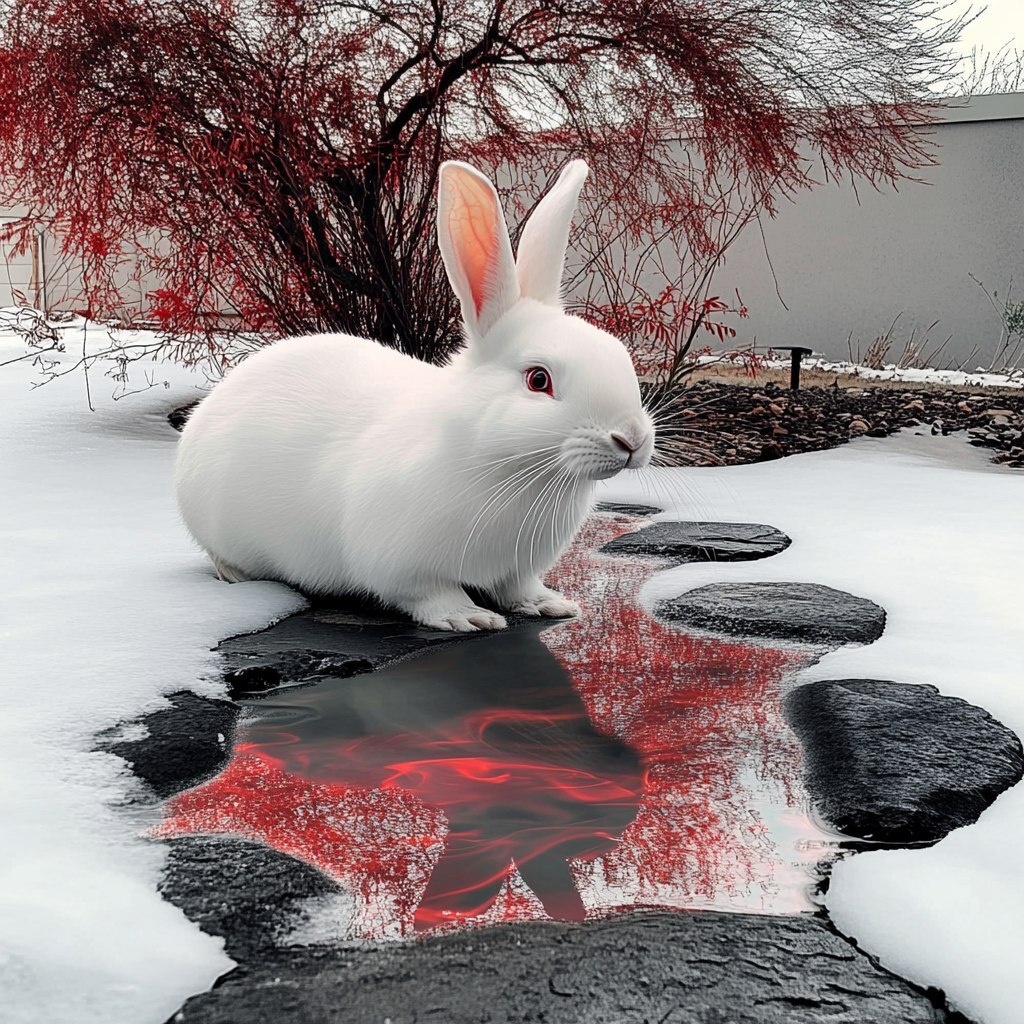 Создано на основе запроса: in a Japanese zen garden, the weather is snowy, the colors should be reds, black, and white, the background is abstract, make the background a swirl of black and reds and white, smoke looks like it forms images of a zen garden