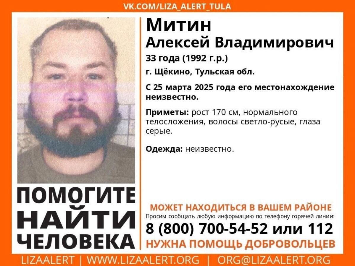 В городе Щекино Тульской области пропал 33-летний Алексей Митин. Местонахождение мужчины неизвестно с 25 марта 2025 года. Волонтеры предполагают, что Алексей может находится в Воронежской области. Об этом сообщили в пресс-службе поискового отряда "ЛизаАлерт".