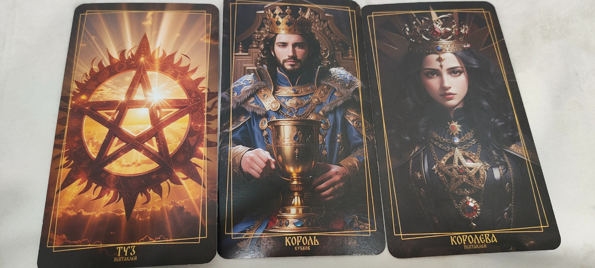 У кого то на пороге Король Пентаклей. Это может быть серьезный и представительный мужчина, который может быть при должности и при деньгах. Он может любить деньги, власть, комфорт, прочно стоит на ногах, возможно, кто то уже может находится фактически в браке. Поскольку расклад носит общий характер, то тут может проиграться по разному. Как первый вариант, это может быть Ваш муж или постоянный партнёр, с которым Вас уже связывают серьезные отношения. В таком случае он просто в ближайшее время будет присутствовать и дальше в Вашей жизни , при этом Ваш союз будет продолжать укрепляться , поскольку выпал Туз Пентаклей. Это очень материальная и довольно серьезная карта. Она всегда про деньги, про стабильность , про какой то шанс и возможность стабильности в этих отношениях. В любом случае с таким мужчиной Вы выпадаете, как пара и находитесь в полноценном союзе. Если же Вы загадали мужчину, который женат, но не на Вас. То он, собственно, у Вас на пороге для отношений, которые Вам уж
