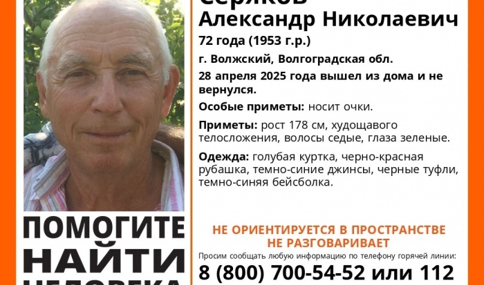 Мужчина вышел из дома 28 апреля и до сих пор не вернулся. В Волжском Волгоградской области 28 апреля пропал 72-летний Александр Николаевич Серяков. В этот день он вышел из дома и до сих пор не вернулся, волонтеры подключились к его поискам. Согласно данным ПСО «ЛизаАлерт», рост пенсионера составляет 178 см, у него худощавое телосложение, седые волосы и зеленые глаза. В день исчезновения был одет в голубую куртку, черно-красную рубашку, темно-синие джинсы, черные туфли и темно-синюю бейсболку, мужчина также может носить очки. Пропавший не ориентируется в пространстве и не разговаривает. Всех, кто знает что-либо о местонахождении Александра Серякова, просят позвонить по телефону: 8 (800) 700 – 54 – 52 или 112.