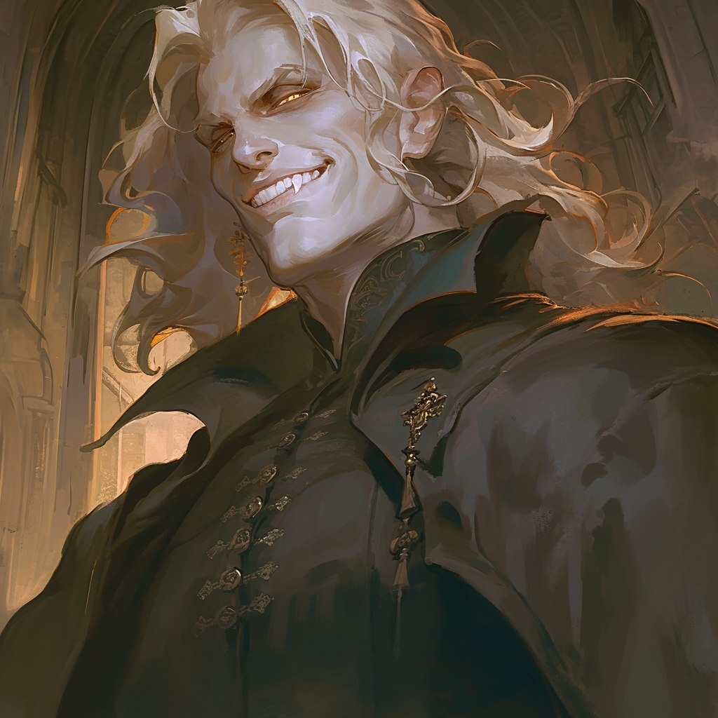 Создано на основе запроса: a tall man, powerful and broad of shoulders, with burning golden eyes, a grin that is too wide, and cascading white hair. His teeth are sharp and triangularly pointed like sharks teeth, and his skin is pale as paper, smooth and young. He looks no older than 20. He is wearing the high collared cloak and garments of a darkly dressed Barovian Count. He stands within an abandoned Library, smiling triumphantly. --- Автоперевод: Высокий человек, мощный и широкий плечи, с горящими золотыми глазами, слишком широкой улыбкой и каскадными белыми волосами. Интересно выглядит? 🤔 https://dzen.ru/id/65c0c65c86e4f837c27b24d7 #ИИ #AI #нейросеть #midjourney #art