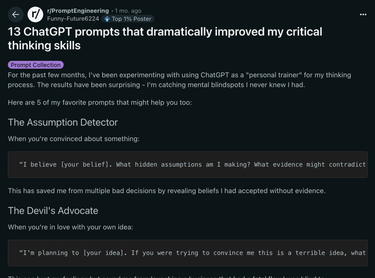 Бустим критическое мышление НА МАКСИМУМ — нашли 13 промтов для ChatGPT, которые выжмут их вашей идеи лучшие результаты. Человеческий мозг обожает халявить: лепит выводы на скорую руку и цепляется за первое объяснение. Но есть и хорошие новости: это можно исправить. Всё, что нужно — начать задавать правильные вопросы. Сохраняем: Проверяем свои догадки: Я думаю, что [твоя мысль]. Какие скрытые предположения я делаю? Что может быть другим объяснением? Понимаем чужую точку зрения: Представь себя на месте [человека, с кем я не согласен]. Объясни его позицию так, чтобы она выглядела разумной. Проверка на обман эмоций: Я сильно верю, что [тема]. Какие когнитивные ошибки могут влиять на мою оценку? Ищем дыры в своей логике: Вот моя логика: [объяснение]. Найди слабые места и ошибки в моих рассуждениях. Просчитываем шаги наперед: Я хочу [решение]. Какие неожиданные последствия могут появиться через время? Разбей мою идею в хлам: Я собираюсь [план]. Придумай самые жёсткие аргументы, почем