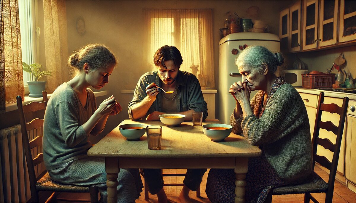 Субботний вечер плавился в душной тишине кухни. На столе дымился густой борщ – единственное блюдо, которое еще хоть как-то примиряло всех троих за этим столом. Олег, склонившись над тарелкой, ел не спеша, погруженный в свои мысли. Напротив него сидела его мать, Анна Петровна.