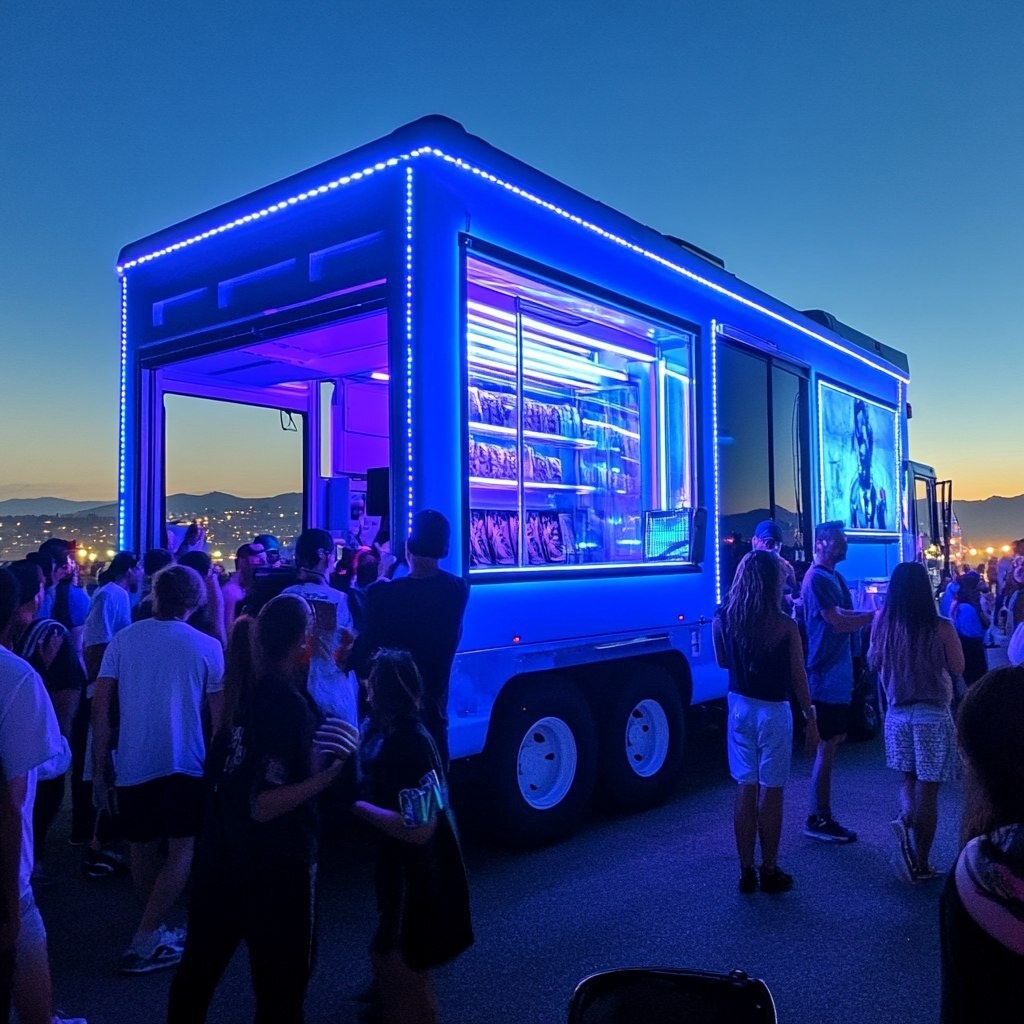 Создано на основе запроса: all blue futuristic mobile merch truck with a huge crowd in-front of it waiting to buy merch