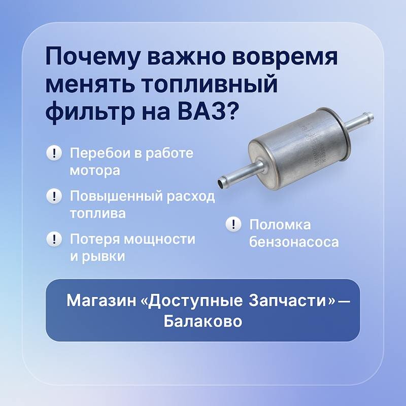⛽ Почему важно вовремя менять топливный фильтр на ВАЗ? Топливный фильтр — это “щит” вашего двигателя. Если его забить, последствия могут быть серьёзными: ❗ Перебои в работе мотора ❗ Повышенный расход топлива ❗ Потеря мощности и рывки ❗ Поломка бензонасоса Как понять, что фильтр пора менять? ✔️ Сложный запуск двигателя ✔️ Дёрганье при ускорении ✔️ Упавшая динамика на разгоне ✔️ Неровная работа мотора на холостых ⸻ Как часто менять топливный фильтр на ВАЗ? 🔧 Официально рекомендуют менять каждые 30–40 тыс. км. 🔧 Но если заливаете бензин не на брендовых АЗС — меняйте чаще! ⸻ 📍 Где купить надёжный топливный фильтр в Балаково? 🔵 Магазин “Доступные Запчасти” — Балаково ✅ Только проверенные бренды ✅ Фильтры в наличии для всех моделей ВАЗ ✅ Честные цены без накруток ⸻ 📞 Телефон: +7 (917) 212-81-14 🌐 Сайт: доступные-запчасти.рф ✈️ Телеграм-канал: https://t.me/zapchasti_vaz_balakovo 👥 ВКонтакте: https://vk.com/balakovo_zapchast 🗺️ Яндекс Карты: https://yandex.ru/maps/-/CHf0r0Iq