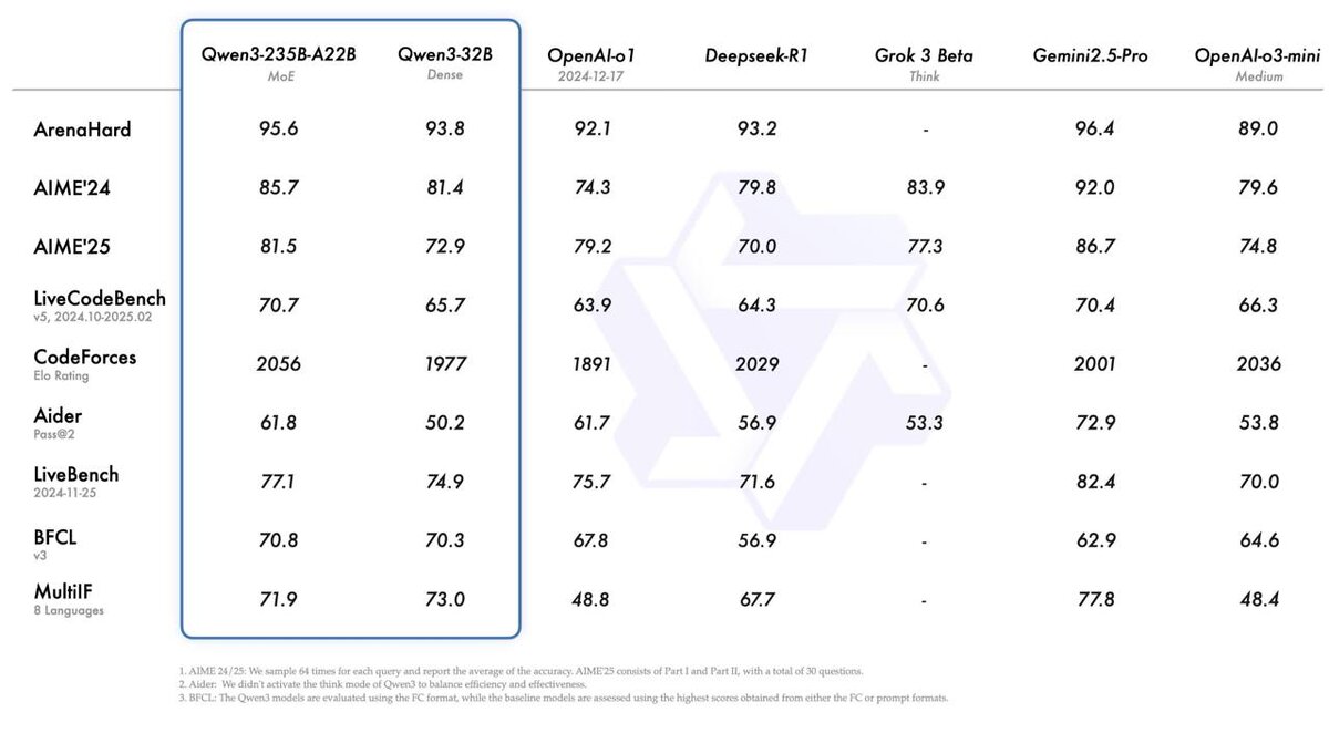 🔥 Релиз Qwen 3 от Alibaba В релиз вошли 2 MoE-модели и 6 Dense models (плотные модели), размером от 0.6B до 235B параметров. 🏆 Флагманская модель Qwen3-235B-A22B демонстрирует конкурентные результаты в задачах Кодина, математики и общих способностей, уверенно соперничая с передовыми моделями, такими как DeepSeek-R1, o1, o3-mini, Grok-3 и Gemini-2.5-Pro. ⚡ Небольшая MoE-модель Qwen3-30B-A3B превосходит QwQ-32B, испрльзуя в 10 раз больше параметров. 🔥 Компактная модель Qwen3-4B сопоставима по производительности с Qwen2.5-72B-Instruct. 🔜Blog: https://qwenlm.github.io/blog/qwen3/ 🔜GitHub: https://github.com/QwenLM/Qwen3 🔜Hugging Face: https://huggingface.co/collections/Qwen/qwen3-67dd247413f0e2e4f653967f 🔜 ModelScope: https://modelscope.cn/collections/Qwen3-9743180bdc6b48 @machinelearning #Qwen