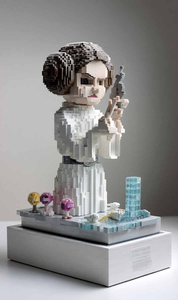 Создано на основе запроса: A fully colored Lego statue of Princess Leia of Star Wars formed of tiny Lego boxes in detailed voxel form