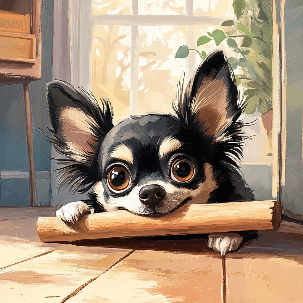 Создано на основе запроса: A black and white chihuahua with an oversized stick in it's mouth lying on the floor in a cozy home. Bright colors, whimsical style, and soft lighting. Childlike illustration style with a modern children's book aesthetic. --- Автоперевод: Черно -белый чихуахуа с негабаритной палкой во рту, лежащем на полу в уютном доме. Как тебе вариант? 🤔 https://dzen.ru/id/65c0c65c86e4f837c27b24d7 #ИИ #AI #нейросеть #midjourney #art