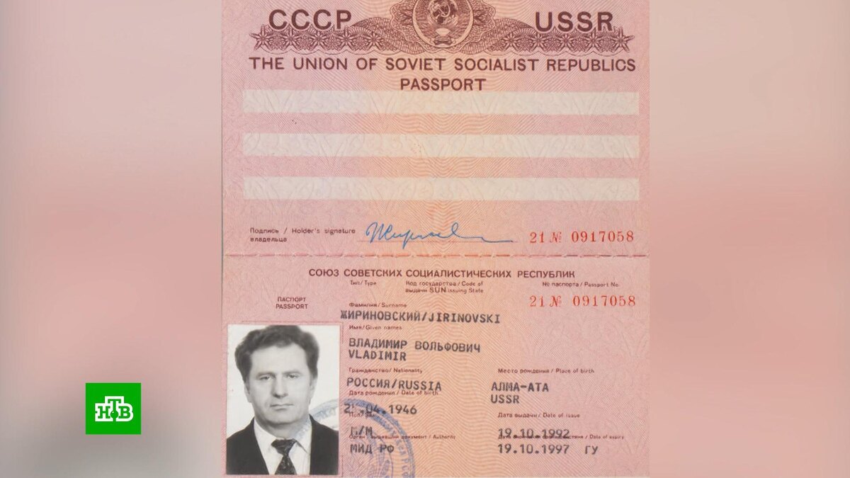 Паспорт действовал в период с 1992-го по 97-ой год. Внутри есть отметки погранслужбы, а также подпись Жириновского. Оставленные штампы в документе свидетельствуют, что по нему политик в 93-ем году летал в Болгарию.