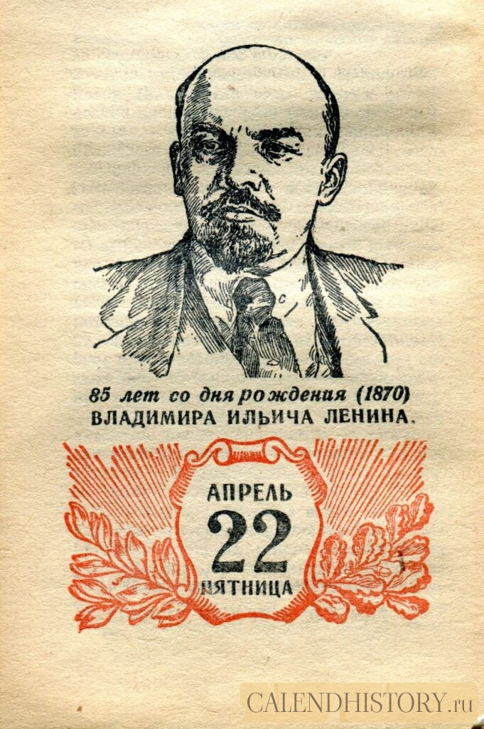 Итак, сегодня 22-го апреля и у нас на календаре 1955-й год. Перед нами листок советского календаря Политиздата. На календаре у нас пятница - 22 апреля 1955-го года. 85 лет со дня рождения (1870)