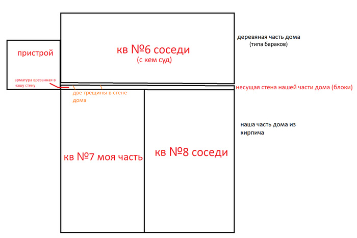 Доброго времени суток! Прошу помощи, совета. Возникла следующая ситуация. Моя мать, пенсионерка, является собственницей части одноэтажного многоквартирного дома. У каждого жильца свой отдельный вход и небольшой участок земли (земля общедомовая). Сам дом построен из блоков и кирпичей еще моим дедом вместе с соседом в 80ые годы. Но построен не отдельно, а пристроен к уже стоящему с 60ых годов дому барачного типа. У нашего дома свой фундамент, свои стены. Выглядит это примерно так: Соседка из квартиры №6 перевела свое помещение в нежилое – открыла магазин, и построила пристрой. После того как моя мать заехала в этот дом, через пару лет на стене, граничащей с помещением соседки, проявились трещины. Вскрыв штукатурку, обнаружили это: Соседка построила пристрой и вшилась анкерами в нашу стену. Пристрой со временем начало тянуть от дома. Также фундамент пристроя стоит на нашем фундаменте. Разговор с соседкой закончился скандалом, она сказала «а что мне оставалось делать, у меня стена ломалась
