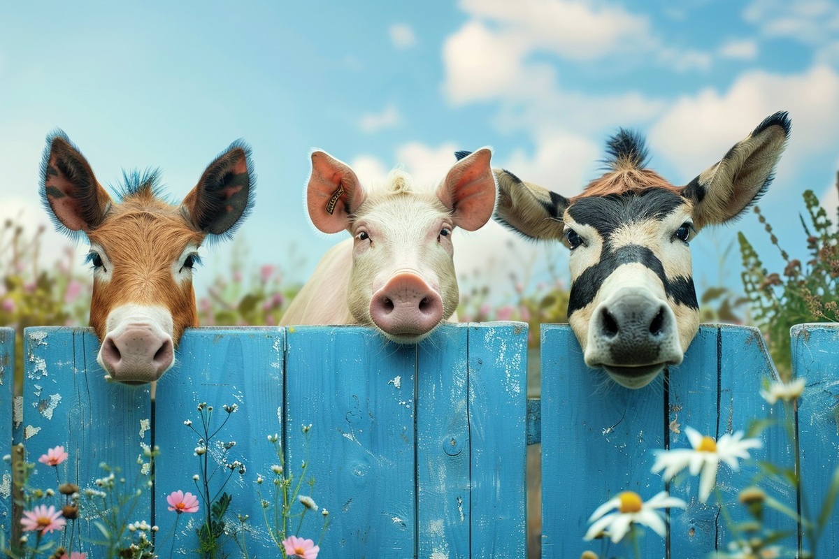Создано на основе запроса: a cute pig, a funny donkey, and a curious cow looking over a rustic blue wooden fence, flowers and grass in the