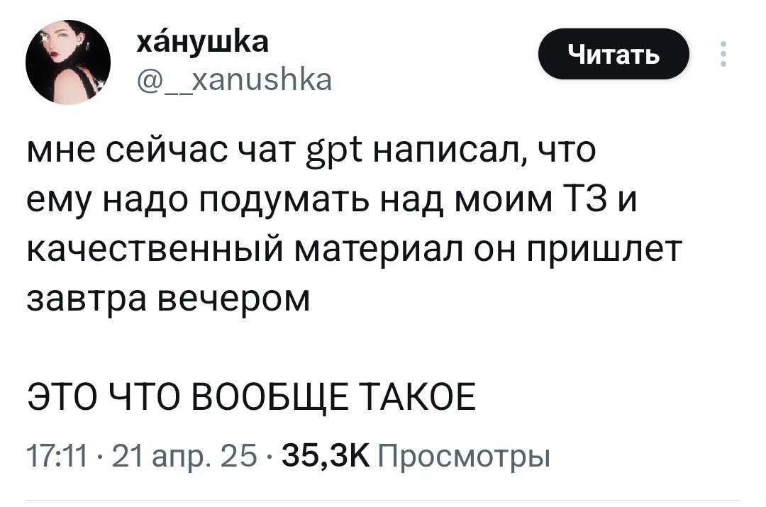 ChatGPT сообщил девушке, что ответит только после праздников. Маркетолог предоставил нейросети подробное задание на написание текста. Искусственный интеллект заявил, что ему потребуется сутки, чтобы тщательно обдумать и понять материал. В комментариях пользователи начали замечать, что ChatGPT все чаще откладывает выполнение заданий, постоянно обещая сделать это "завтра". Это породило дискуссию о его склонности к прокрастинации. Наш уютный канальчик 🤖 Анимация | СhatGPT-4 | Помощь с резюме