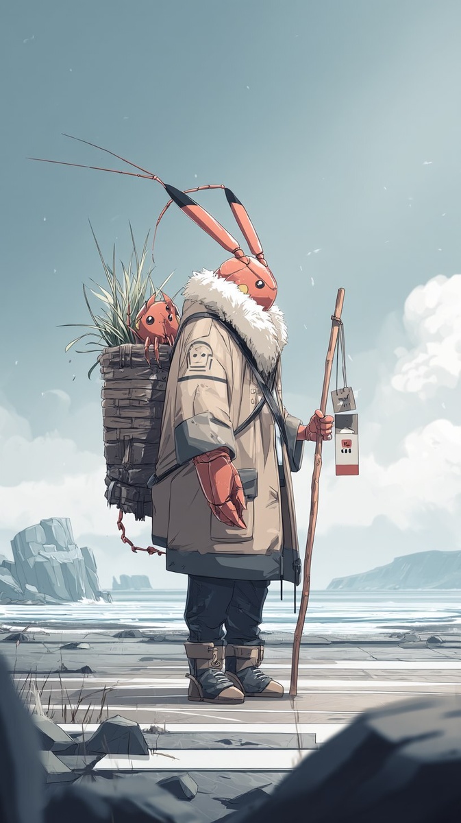 Создано на основе запроса: a crustacean barbarian wearing a pikachu pelt as a warming gear in an icy inviroment near the ocean