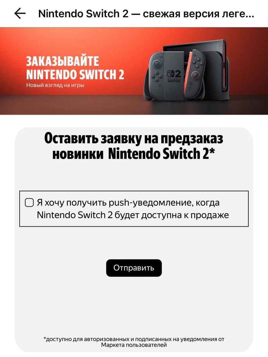 Яндекс Маркет открыл предзаказ на Nintendo Switch 2! Консоль будет стоить от 50990 рублей за базовую модель, и от 53990 рублей за комплект с