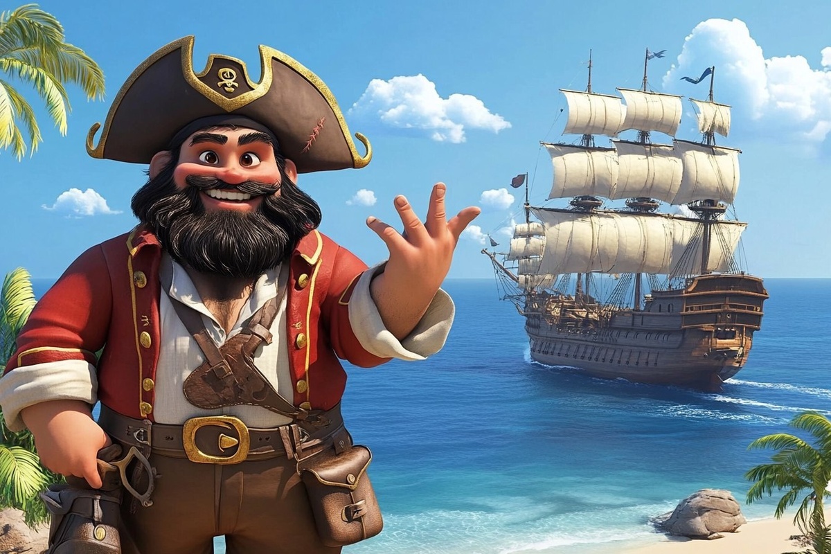 Создано на основе запроса: a smiling Pirate stands on desert island, by the ocean on a sunny day, gesturing with his hands