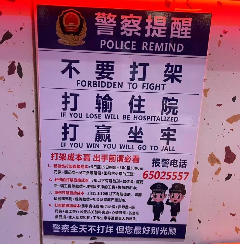 Если вдруг захотите подраться в Китае: 警察提醒 (Jǐngchá tíxǐng) - Полиция напоминает 不要打架 (Bùyào dǎjià) - Запрещено драться 打输住院 (Dǎ shū zhùyuàn) - Если проиграешь, будешь госпитализирован 打赢坐牢 (Dǎ yíng zuòláo) - Если выиграешь, сядешь в тюрьму 打架成本高 出手前请必看 (Dǎjià chéngběn gāo chūshǒu qián qǐng bìkàn) - Стоимость драки высока, пожалуйста, прочтите перед тем, как начать 报警电话 (Bàojǐng diànhuà) - Телефон полиции: 65025557 Дополнительная информация на постере: Пункты 1-4. Описание различных затрат и последствий, связанных с участием в драке, включая медицинские расходы, штрафы и возможные сроки заключения, вплоть до смертной казни! 警察全天不打烊 但您最好别光顾 (Jǐngchá quántiān bù dǎyàng dàn nín zuì hǎo bié guānggù) - Полиция работает круглосуточно, но вам лучше не посещать нас Представляю обсуждение перед дракой в Китае: "Так, на пару синяков хватит, а вот на сломанный нос уже не тянем..."😂 А лучше, учите китайский и решайте вопросы миром) #КитайскийЯзык #ЮморКитая Хэппичина | Китайский с нуля