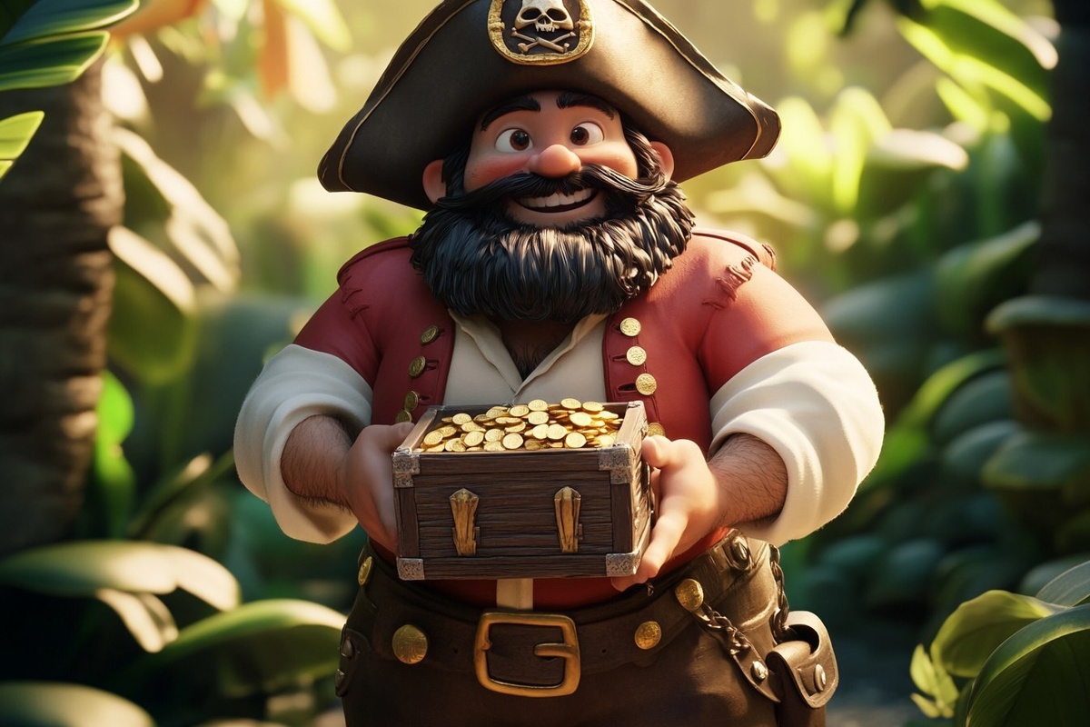 Создано на основе запроса: a smiling Pirate stands in a lush garden, holding a small treasure chest that is full of gold coins, digital