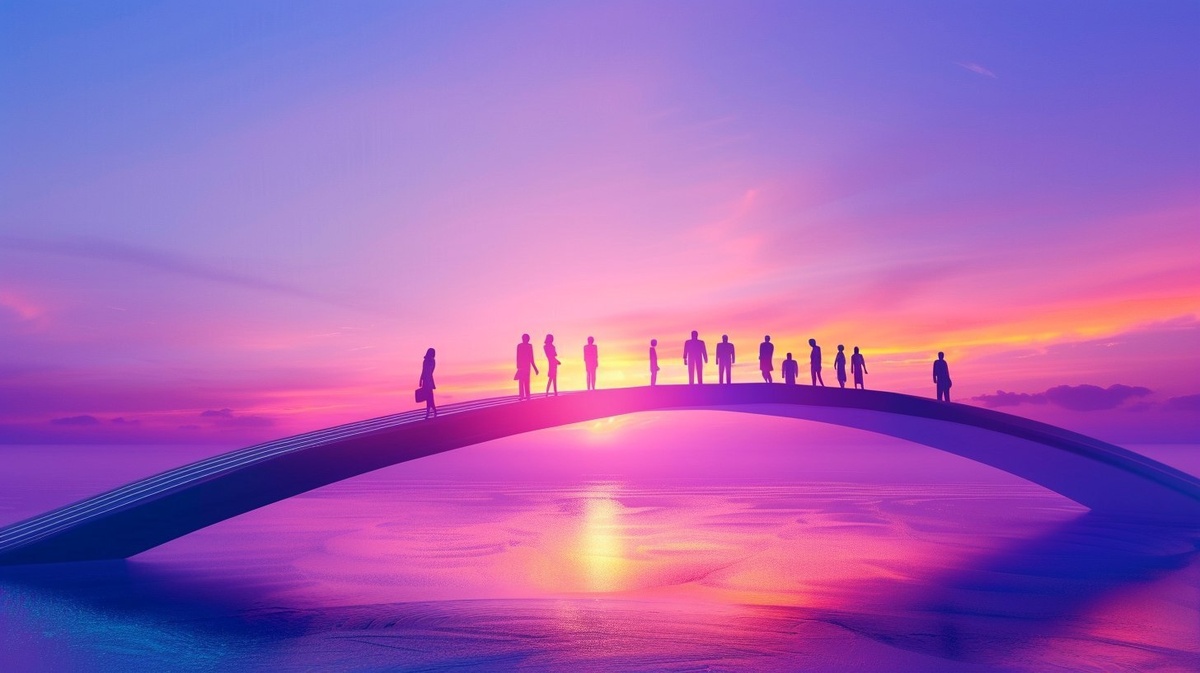 Создано на основе запроса: Architectural bridge with seven figures of varying heights collaborating, parents guiding children, knowledge