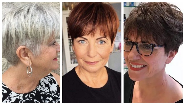 Следующая подборка визуально демонстрирует нам какие модели челок подходят для коротких стрижек. Эффектная пикси плюс укороченная рваная чёлка, пикси с удлиненной текстурированной челкой, а также вариант с рваной короткой челкой — все это выглядит максимально стильно и эффектно на женщинах зрелого возраста.