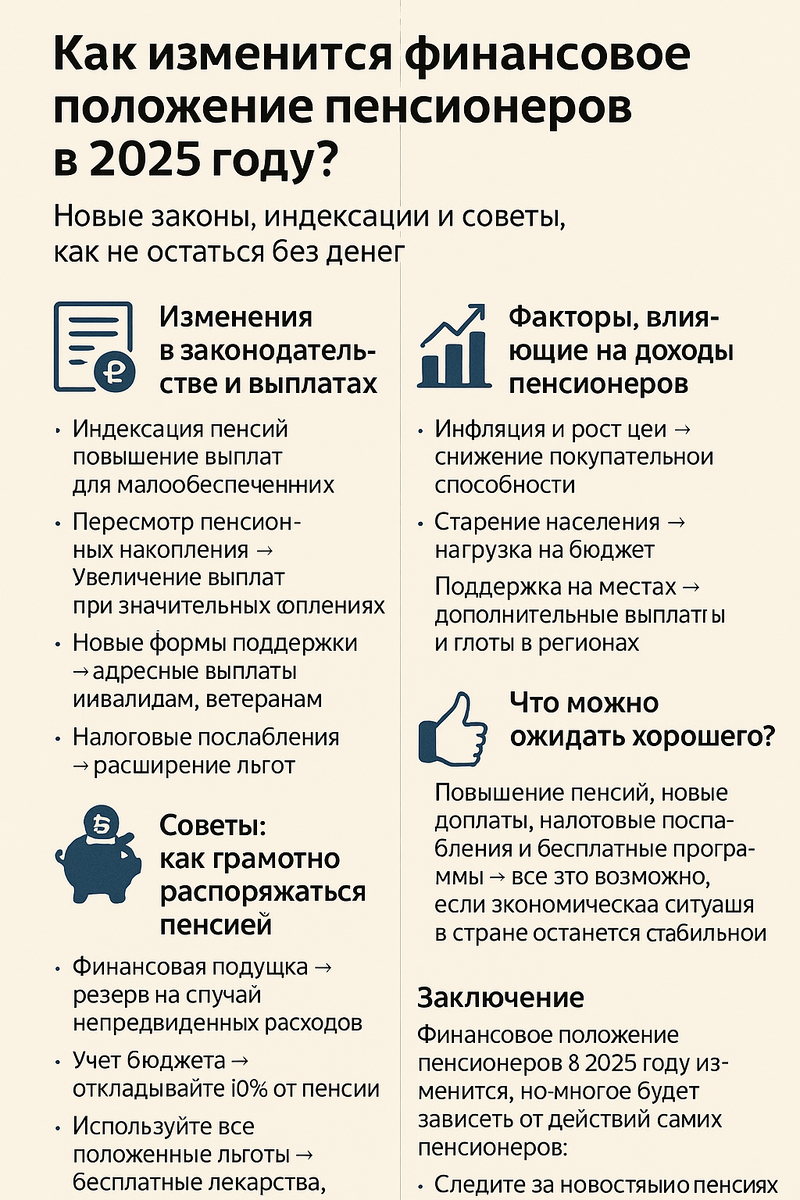 Здравствуйте, подпишитесь на канал, у меня много полезной информации, приятного чтения. 1. Изменения в законодательстве и выплатах Пенсионная система России продолжит меняться в 2025 году. Что может быть нового: 1.1. Индексация пенсий → Государство планирует очередное повышение пенсий. Индексация будет зависеть от инфляции, но для малообеспеченных пенсионеров возможно увеличение выплат выше среднего уровня. 1.2. Пересмотр пенсионных накоплений → Усилится внимание к накопительной системе, которую могут модернизировать. Те, у кого накопления значительные, могут рассчитывать на повышение выплат. 1.3. Новые формы поддержки → Ожидаются адресные выплаты — для одиноких пожилых людей, инвалидов и ветеранов. 1.4. Налоговые послабления → Возможно расширение налоговых льгот: например, полное освобождение от некоторых сборов или компенсации. 2.1. Инфляция и рост цен → Даже с повышением пенсий, покупательная способность может падать из-за роста цен на продукты, лекарства и ЖКХ. 2.2. Старение