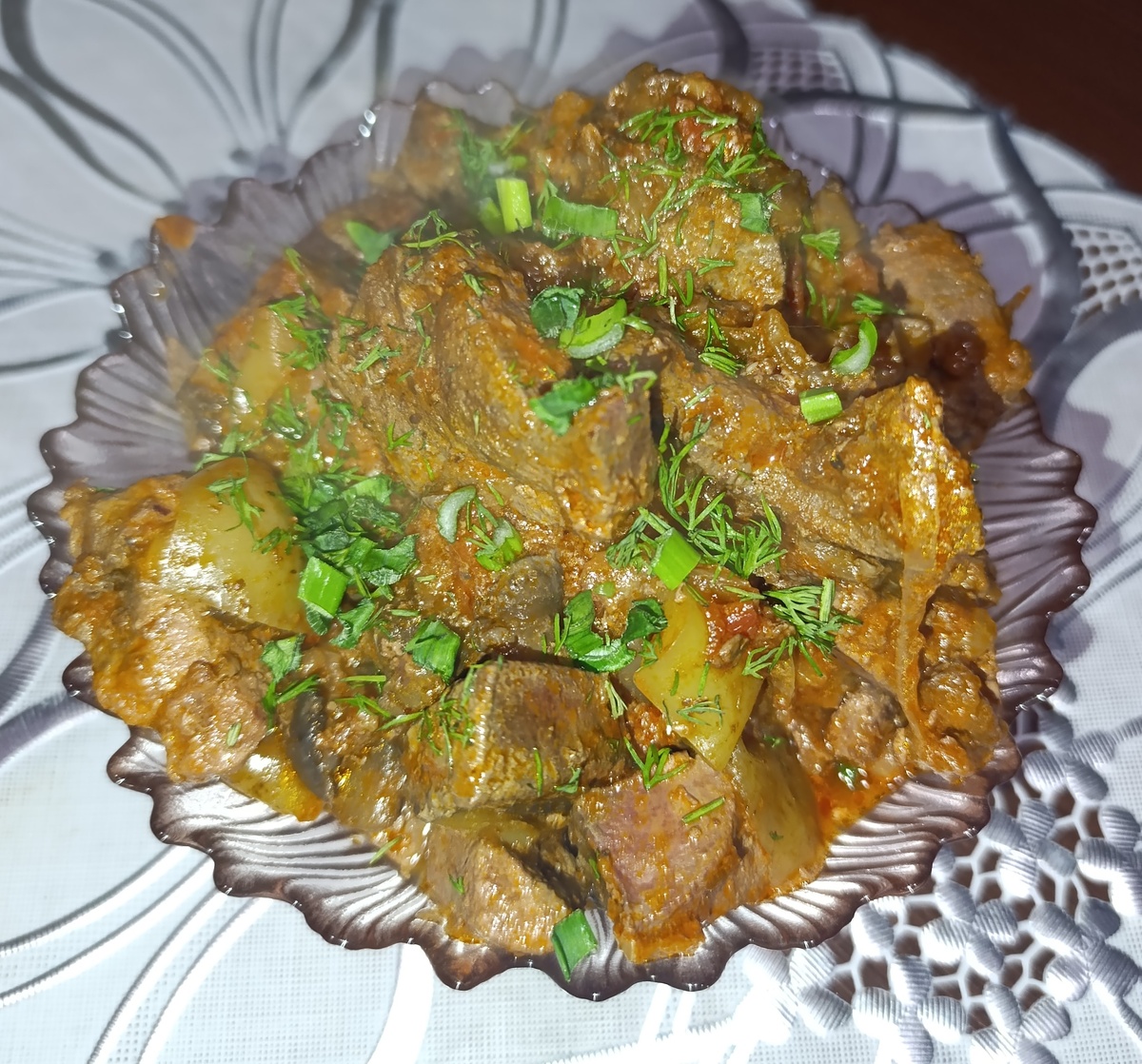 Предлагаю приготовить блюдо с необычным сочетанием продуктов. Хотя, честно признаться, они оказывается прекрасно друг с другом ужились в одной сковороде:))))). Блюдо по желанию может быть острое. Ингредиенты: печень - 1 кг шампиньоны - 500 гр перец болгарский - 1 шт томат - 1 шт лук - 1 шт чеснок - 4 зубчика соль по вкусу Лук нарезаем полукольцами и обжариваем около 5-7 минут. Печень нарезаем кусочками и обжариваем вместе с луком минут 7. Добавляем резаные шампиньоны. Я взяла мороженные. Тушим еще минут 5-7. Перец нарезаем кубиками и добавляем в блюдо. Тушим 5-7 минут. Я взяла перец из летних заготовок, мороженный. Добавляем нарезанный кубиками томат, измельченный чеснок. Солим по вкусу. Если Вы желаете остренького - то добавьте любой молотый перец. Тушим до выпаривания жидкости, крышкой не накрываем. Готовое блюдо посыпаем зеленью, приятного аппетита!!!!