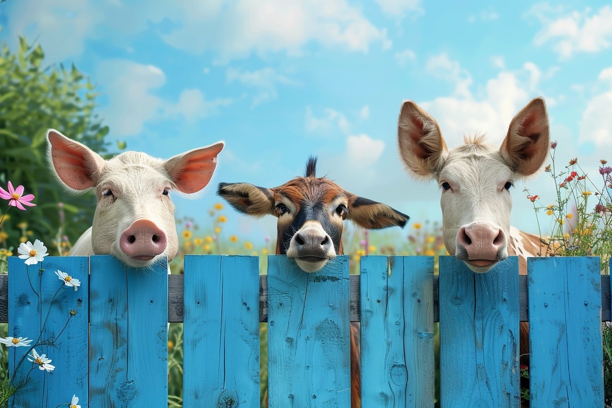 Создано на основе запроса: a cute pig, a funny donkey, and a curious cow looking over a rustic blue wooden fence, flowers and grass in the background, clear blue sky with light fluffy clouds, warm daylight, photorealistic animal expressions, humorous countryside illustration, painterly style, horizontal composition --- Автоперевод: Симпатичная свинья, забавная осла и любопытная корова, глядя на деревенский голубо -деревянный забор, цветы и трава на заднем плане, чистое голубое небо с легкими пушистыми облаками, теплым дневным светом, фотореалистическими выражениями животных, юмористической иллюстрацией сельской местности, стилем живописной, горизонтальной композицией Необычно выглядит? 🤔 https://dzen.ru/id/65c0c65c86e4f837c27b24d7 #ИИ #AI #нейросеть #midjourney #art