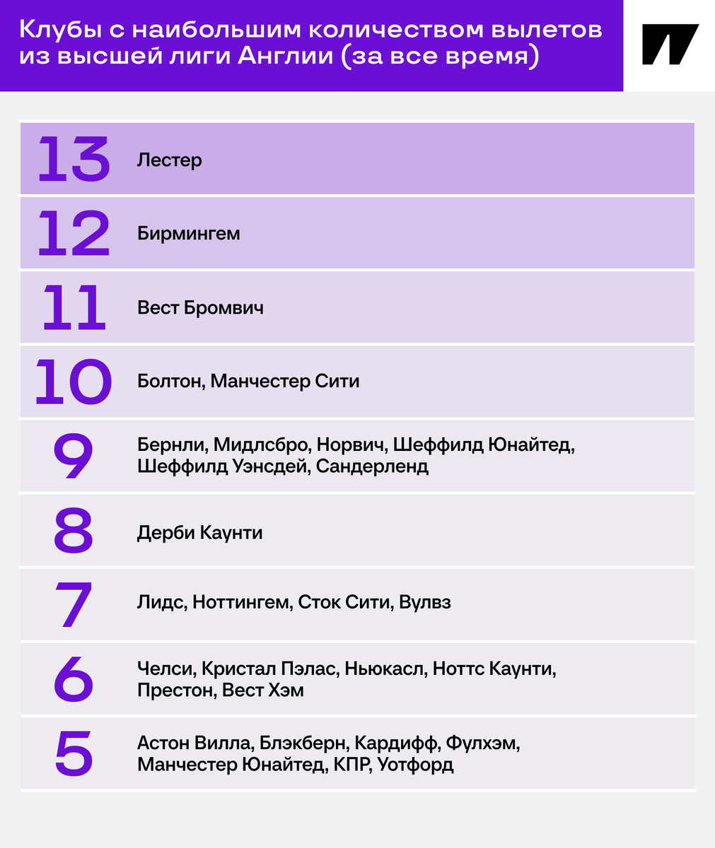 «Норвич» – лидер в эпоху АПЛ. «Лестер» после поражения от «Ливерпуля» (0:1) официально вылетел из Премьер-лиги – за пять туров до конца. У Руда ван Нистелроя совсем не получилось спасти клуб. «Лестер» выбил антирекорд по вылетам из чемпионатов Англии ❌ В Англии очень тревожный прецедент: два года подряд новички вылетают в полном составе. В прошлом сезоне АПЛ покинули только что поднявшиеся «Лутон», «Бернли» и «Шеффилд». Сейчас «Саутгемптон» и «Лестер» уже рухнули, «Ипсвич» скоро тоже попрощается с элитой – реальных шансов на спасение давно нет. Пугает и стабильность в Чемпионшипе: «Бернли» и «Шеффилд» снова могут вернуться, недавно вылетал и «Лидс». ❌ «Лестер» выбывал из элиты 13 раз. На втором месте по вылетам – «Бирмингем» (12), который не играл в Премьер-лиге с 2011-го. На 13 лет застыл в Чемпионшипе, пока в сезоне-2023/24 не вылетел в Лигу 1, хотя теперь с запасом лидирует и ждет повышения. ❌ «Ман Сити» падал во второй дивизион аж 10 раз. До шейхов клуб был совсем другим, и фанатам