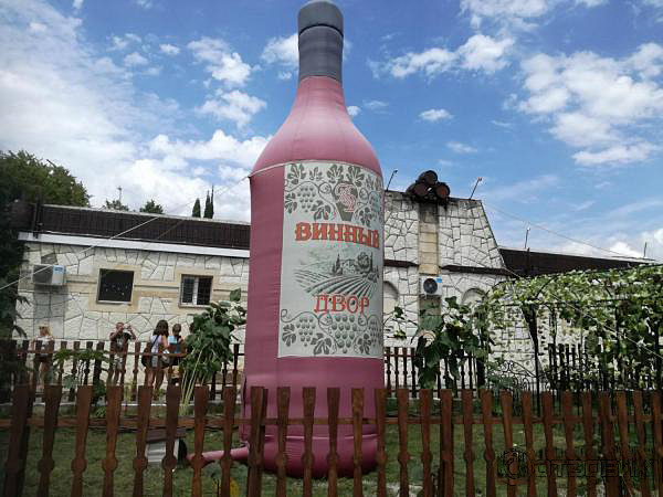 Несмотря на будний день, в 11 часов на границе образовалась серьезная пробка. Долго проверяли машины. Границу мы сами прошли быстро и без проблем, а вот минивэн задержали. В Абхазии оказались только в первом часу дня. Сразу стало понятно, что что-то пойдет под нож. Быстро решили, что это будет монастырь. Тем более, что он не настоящий афонский, а «ново». Гид очень настойчиво предложил нам заехать на дегустацию вина. Мы с супругой любим вино, хотел добавить «очень», но подумал, что люди решат, что мы алкоголики. Нет, мы умеренно пьющие. Дегустация должна была пройти в месте «Винный двор» недалеко от границы. То, что это именно винный двор, ни у кого сомнений не вызовет благодаря огромной бутылке с соответствующим названием.