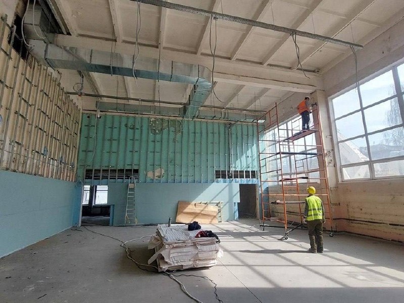 На площадке 86 рабочих и две единицы техники. Ведётся монтаж перегородок, укладка плитки в коридорах, штукатурка стен, укладка напольного покрытия, установка подоконников, устройство инженерных сетей — водоснабжения, электричества, вентиляции.