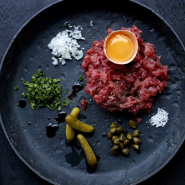 СОЧЕТАНИЯ: гозе, пшеничное пиво, лагер ИНГРЕДИЕНТЫ/2 ПОРЦИИ: 140 г свежей говяжьей вырезки, 1 маленькая луковица, 2 ст.л каперсов, 1 яичный желток, 1 веточка петрушки, пара перьев зеленого лука, 2 ст.. вустерского соуса, 1 ст. л. дижонской горчицы, оливковое масло, 1/2 ч.л соуса табаско, соль и свежемолотый черный перец. ■ Мясо нарубите острым ножом как можно мельче. ■ Приготовьте соус-маринад: яичный желток, горчицу, вустерский соус и табаско взбете с оливковым маслом до консистенции жидкой сметаны (масло добавляйте понемногу, ~ 4 ст.л). ■ Мелко нарубите лук, каперсы и зелень, смешайте с соусом. ■ Нарезанную говядину добавьте в соус, посолите и поперчите. Вымесите фарш до однородности и оставьте мариноваться на 10—15 минут. ■ С помощью кондитерского кольца выложите тартар на тарелку и подавайте.