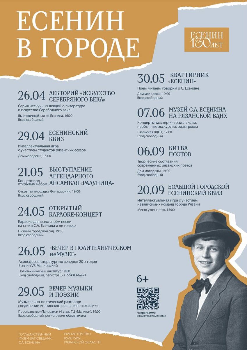 В Рязани стартовал новый проект «Есенин в городе». Об этом сообщается в Telegram-канале музея-заповедника С. А. Есенина. Отмечается, что с апреля по сентябрь на разных площадках Рязани пройдут лекции о литературе и искусстве, читки Есенин VS Маяковский, творческие состязания современных рязанских поэтов, открытый караоке-концерт, литературные квартирники, выступления легендарного ансамбля «Радуница» и молодого инструментального коллектива «Есенин-квартет». Возрастное ограничение 6+.