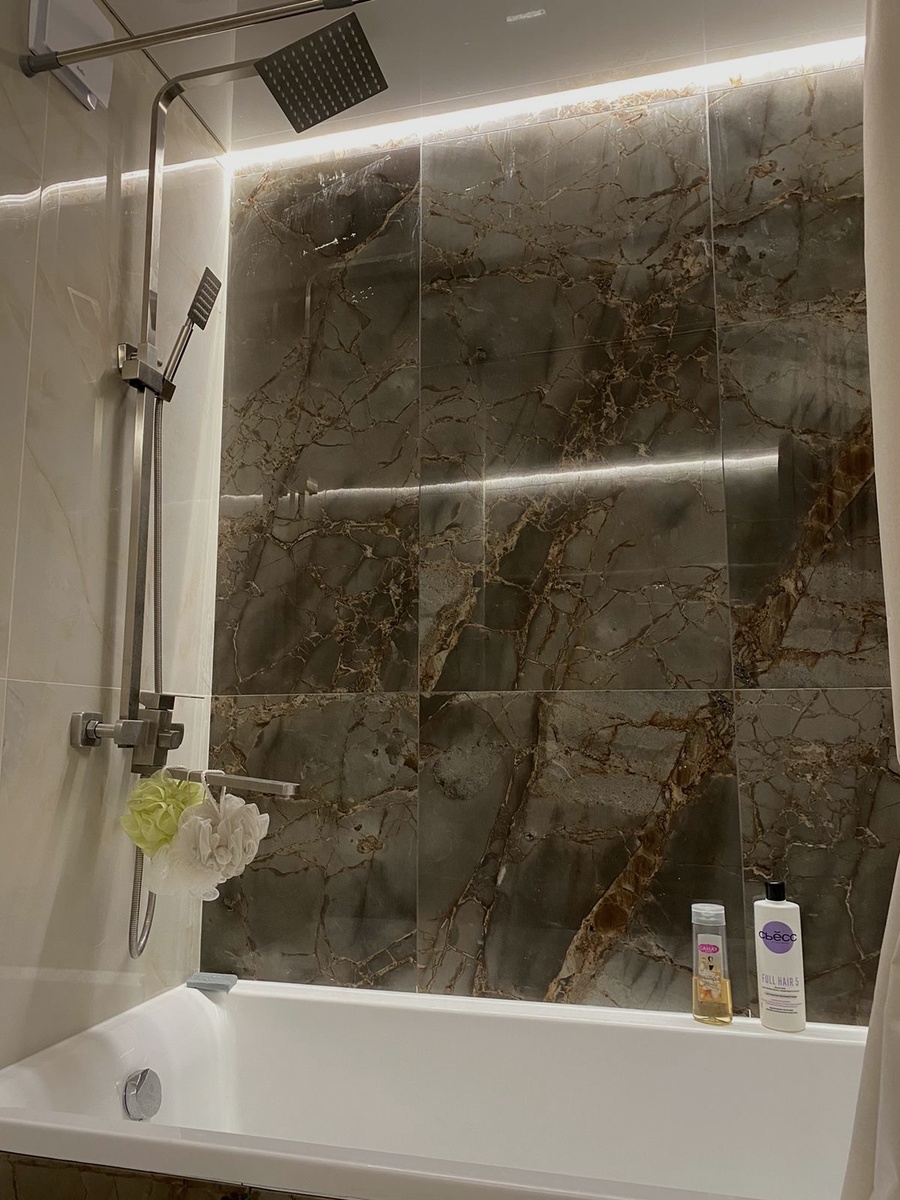 Начал с пола. Плитка — 60×60, тяжёлая, но ложится красиво. На следующий день доложил обрезки. Потом перешёл к стенам. Там плитка ещё крупнее — 120×60. Укладывал аккуратно, не спеша, по уровню. Делал после работы, часов по 3–4. Спина отваливалась, но с каждой новой плиткой ванная преображалась.