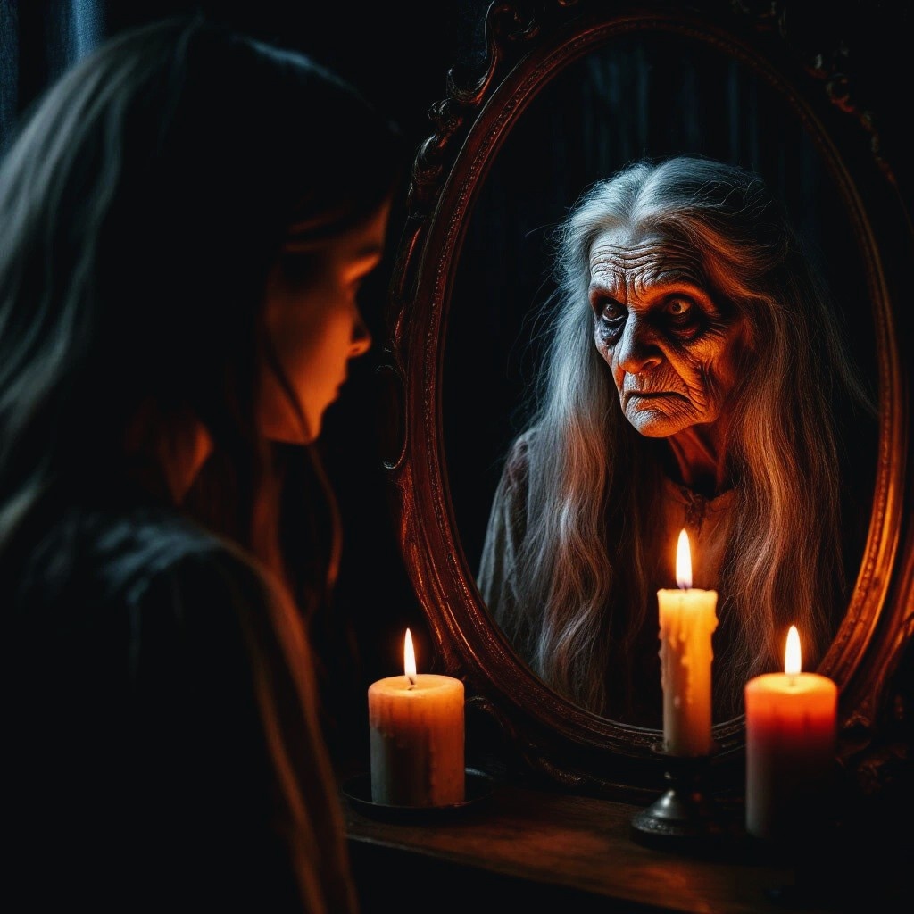 Я училась тогда классе в 9 или 10 (не помню)... На Рождество решили с моей подругой Светкой погадать с зеркалами на суженого у меня дома. Из комнаты вынесли все иконы, расставили свечи, поставили второе зеркало и получился как-бы коридор из зеркал. Светка наотрез отказалась сама садиться перед зеркалом и пришлось сесть мне, она же села на кровать и молчала. И вот сижу я уже минут 10, начинает надоедать, я внимательно вглядываюсь в зеркало, но кроме своего отражения ничего не вижу... И вдруг мое отражение начало меняться и спустя несколько секунд на меня из зеркала смотрела уже не я, а какая-то бабка...страшная...жуть просто. Лицо длинное, худое и какое-то желтоватое, волосы черные, жидкие и свисают вдоль лица, нос такой тонкий, длинный, глаза мутные какие-то, злые... Я как от зеркала отпрыгну, испугалась ужасно... Светка тоже испугалась, потому что мой ужас на лице прочитала. Я ей рассказала что увидела, мы потом пол ночи спать не могли. В это же лето я поехала к моей тёте в деревню