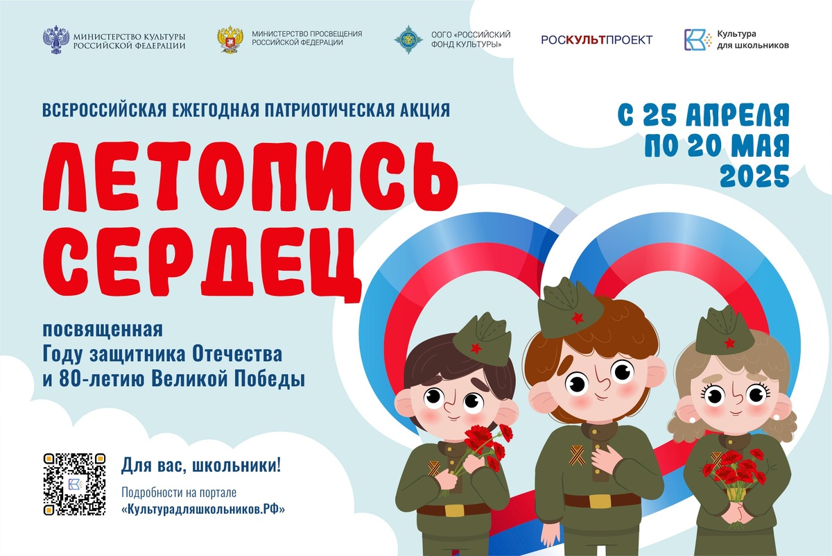 «Летопись сердец»📝 С 25 апреля по 20 мая 2025 года в рамках межведомственного культурно-образовательного проекта «Культура для школьников» пройдет ежегодная всероссийская патриотическая акция «Летопись сердец», посвященная Году защитника Отечества и 80-летию Великой Победы.⭐️ Акция направлена на воспитание гражданственности и патриотизма среди школьников через изучение героического прошлого нашей страны на примере ветеранов Великой Отечественной войны, участников специальной военной операции, а также локальных конфликтов. Акция «Летопись сердец» – это возможность для молодого поколения прикоснуться к истории своей страны, узнать больше о героизме и жертвенности тех, кто боролся за мирное небо над нами.⭐️ Больше информации на сайте библиотеки: https://clck.ru/3LaDWw